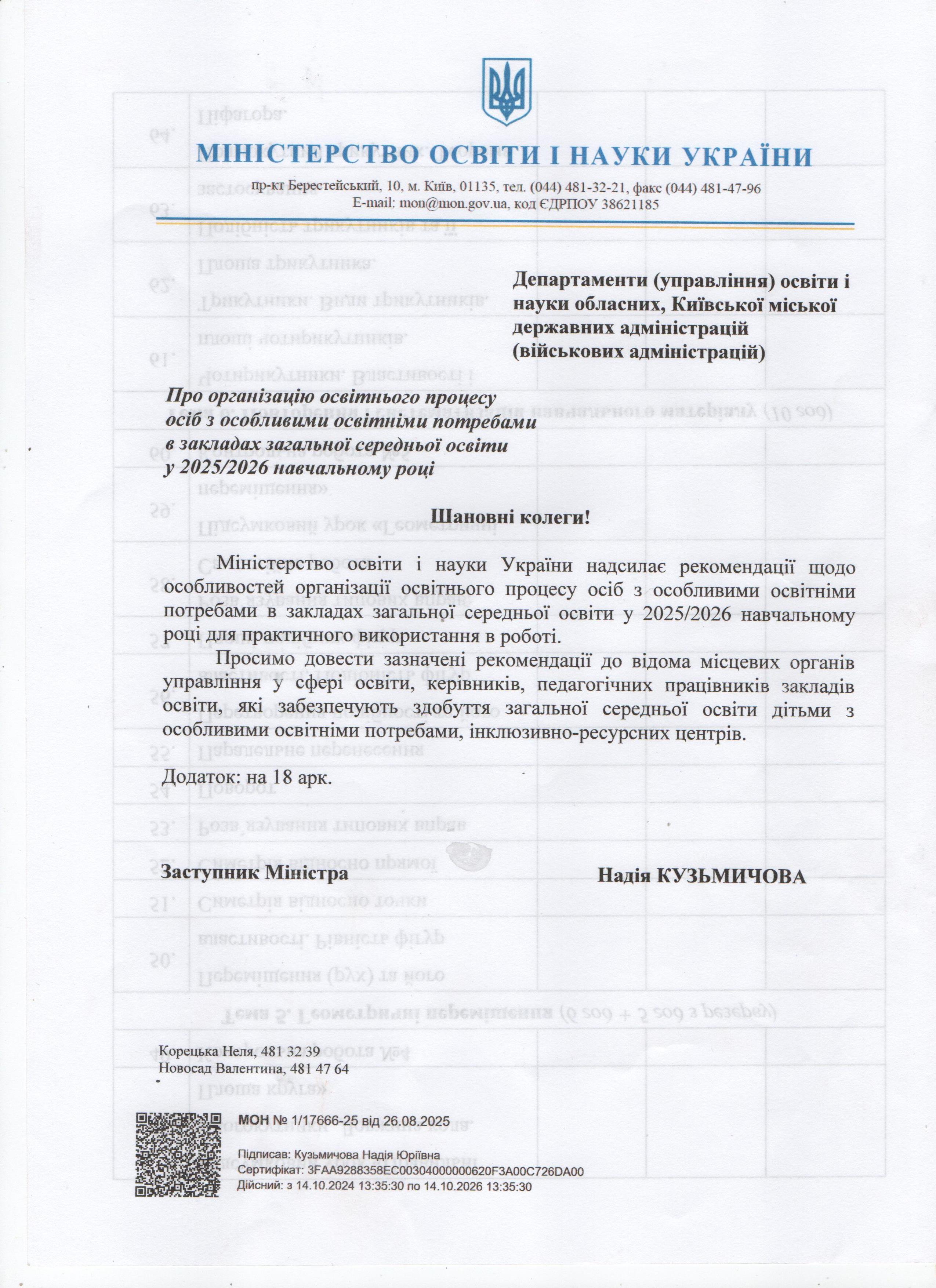 Рекомендації щодо особливостей організації освітнього процесу осіб з особливими освітніми потребами в закладах загальної середньої освіти у 2025/2026 навчальному році